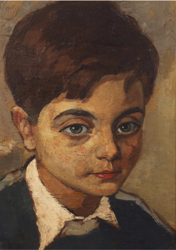 A painted portrait of a young boy with short brown hair, blue eyes, and wearing a white collared shirt and dark sweater, against a muted background.