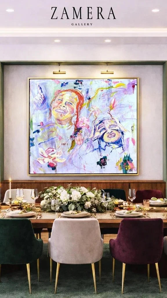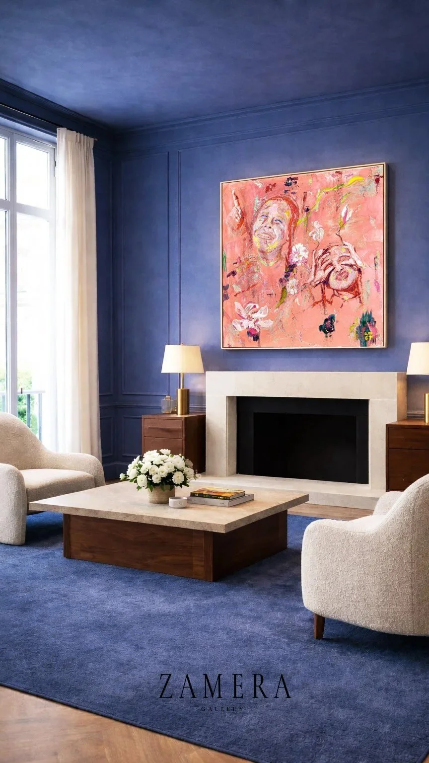 Color radiates from the artwork outward, not the other way around. The room becomes a quiet frame. The painting becomes presence.