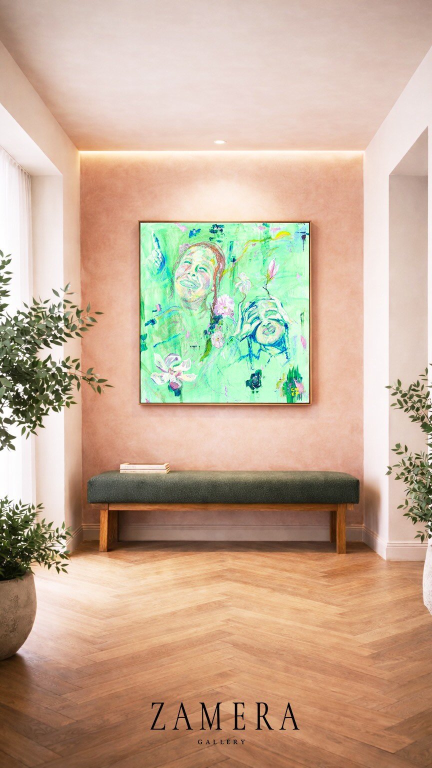 Adar — Verdant Joy | An entrance gallery where chalk white walls frame a warm mineral plaster envelope, allowing the artwork's luminous greens and tender pinks to radiate outward. The eucalyptus bench grounds the vertical composition while oak chevron flooring guides the eye forward. Soft cove lighting traces the ceiling, creating a gentle halo that holds the moment. Image : Zamera Gallery